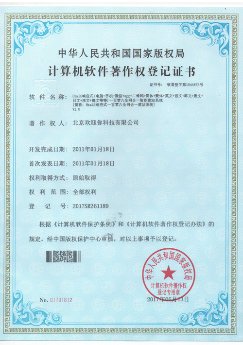 北京歡迎你科技有限公司獲得多項版權局"計算機軟件著作權登記證書",并已獲得“全國誠信經(jīng)營示范單位”、“全國質量服務客戶滿意誠信企業(yè)”和“全國重合同守信用品牌企業(yè)”等榮譽稱號。